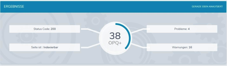 Im oberen Bereich der Analyse werden die zentralen Ergebnisse grafisch zusammengefasst. In diesem Beispiel erfährst Du, dass die URL erreichbar (Status Code 200 OK) und indexierbar ist. Das sind schon einmal gute Voraussetzungen. Allerdings werden auch vier Probleme sowie 16 Warnungen angezeigt. Der OPQ weist einen Wert von 38 von 100 möglichen Punkten auf. Es besteht also Handlungsbedarf.